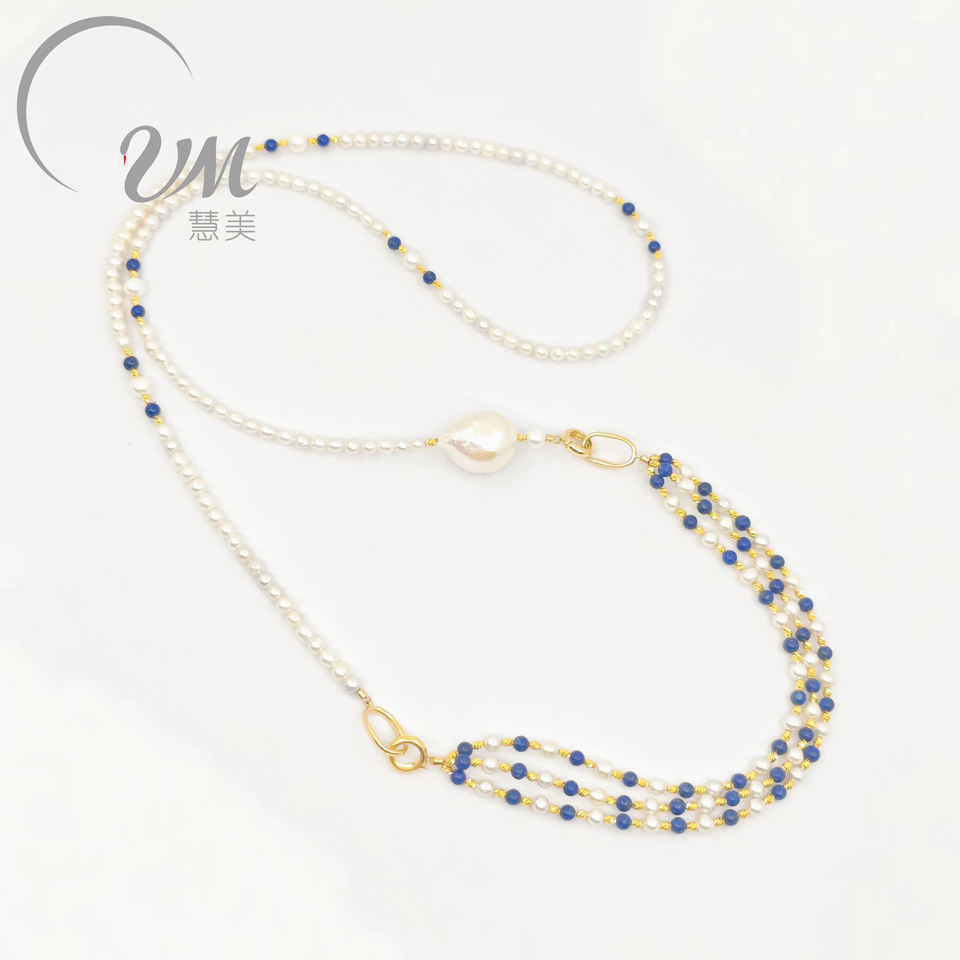 18K Yellow Gold CHIC Series Necklace Simple High-End Freshwater Pearl Lapis Lazuli Classic Style Strand Chain Wearable Two Ways