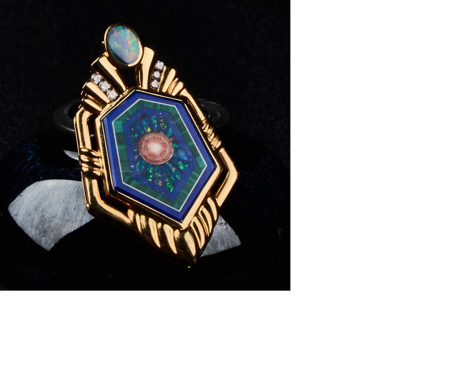 18KY GOLD GEMSTONE INTARSIA (OPAL , MALACHITE , LAPIS , RHODOCROSITE , STALACTITE ) PENDANT WITH DIAMOND