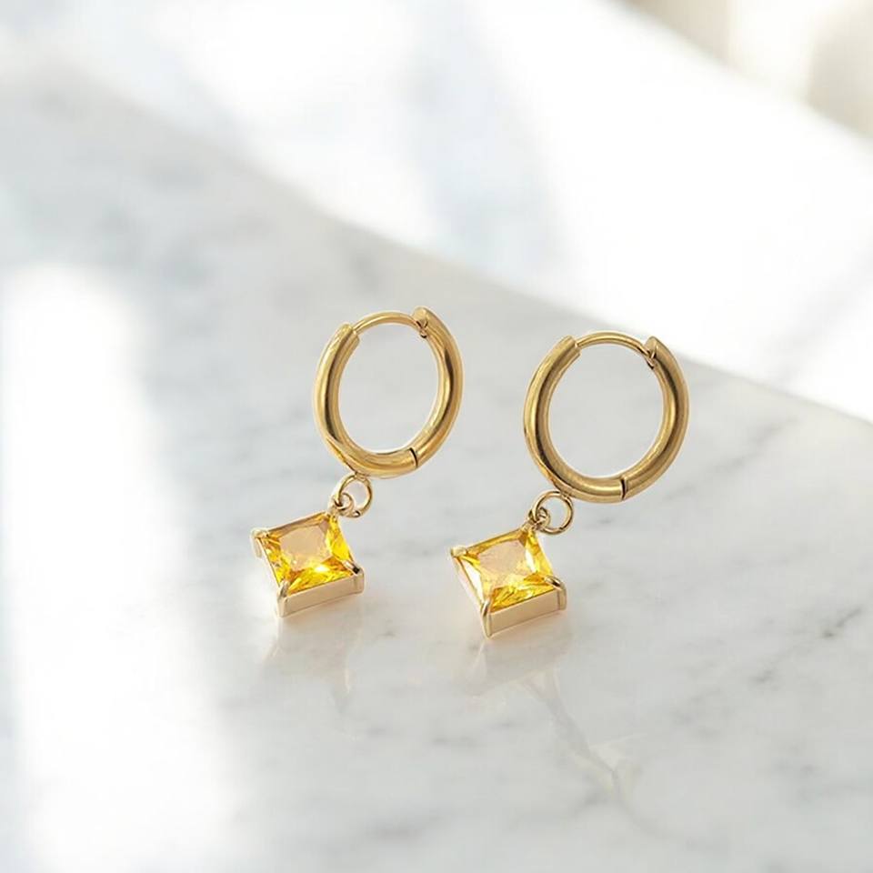 18k Gold Plated Square Citrine Gemstone Hoop Earrings - 925 Sterling Silver Drop Earrings - Handmade Fashion Earrings Jewelry
