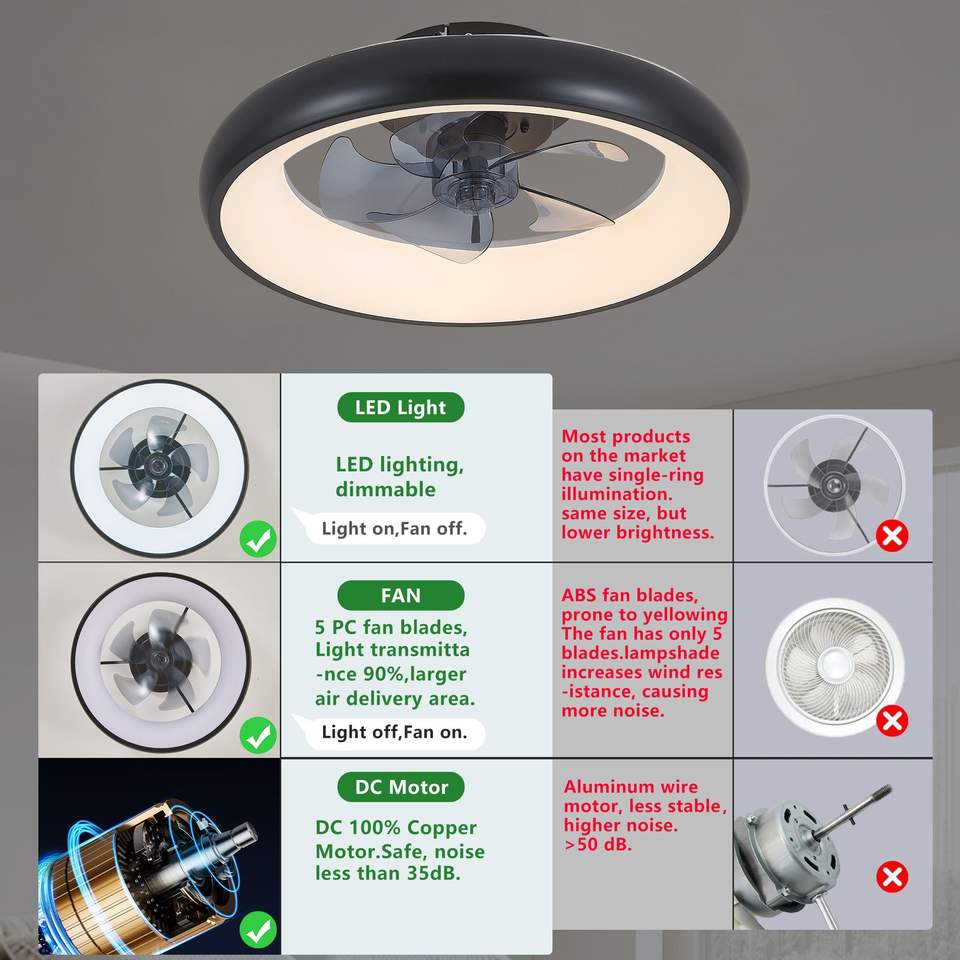 19.7-Inch Black LED Ceiling Fan Light Dimmable Adjustable Color Temperature Modern Smart APP Remote Control for Living Dining