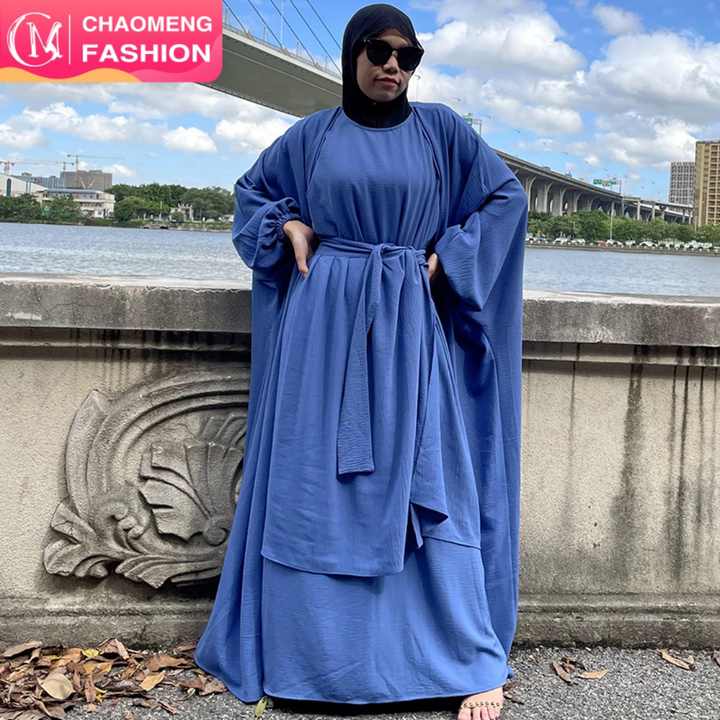 1944# Bubble Crepe Solid Color Three Pieces Cardigan and Separate Wrap and Sleeveless Inner Dress Hot Sale Abaya Set