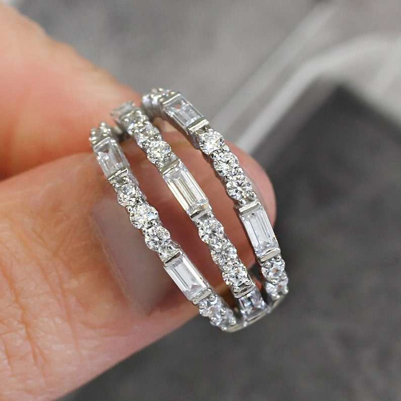 1K Solid Gold Stacked Ring Original Moissanite Baguette Unique Three Row Eternity Wedding Anniversary Band Gift for Her