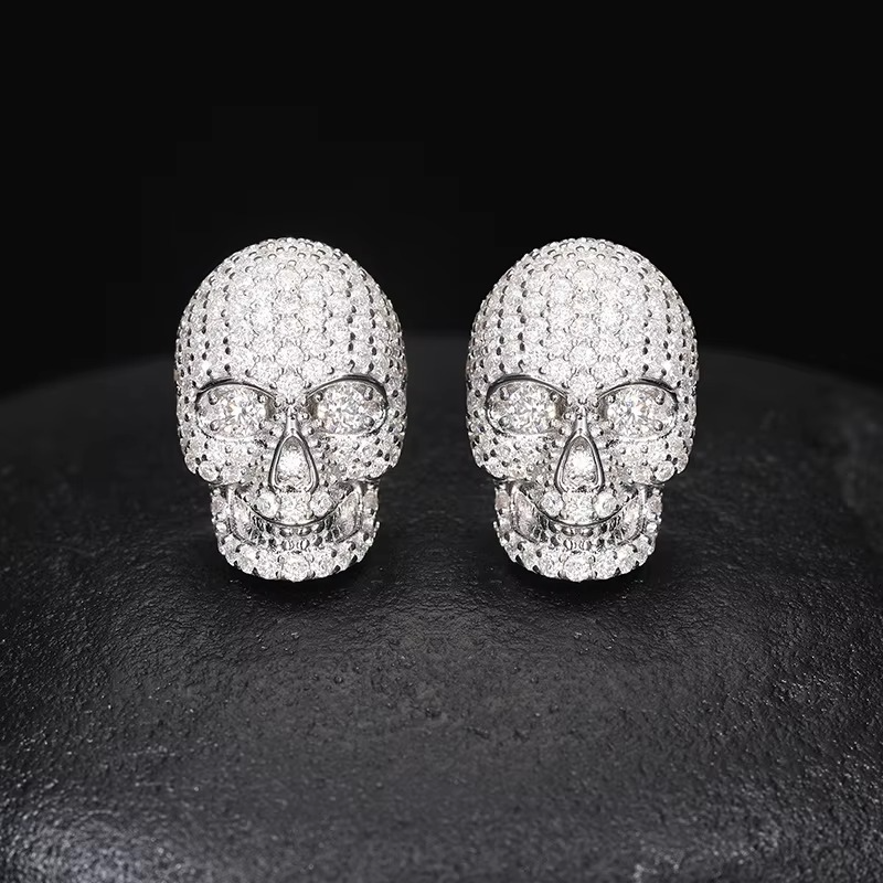 1Pair S925 Sterling Silver Moissanite Diamond Skeleton Skull Stud Hip Hop Earring for Men & Women