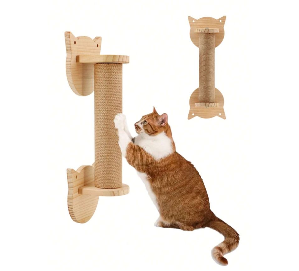 1pc Wall-Mounted Durable Natural Pine Wood Eco-Friendly European Cat Scratching Post Face Pattern Installation Screws Pet Bed