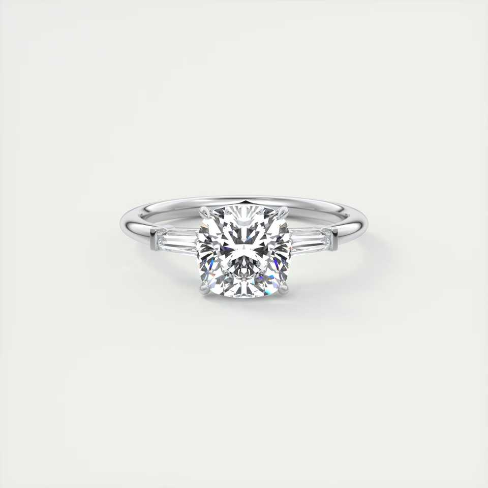 2.15 Carat Cushion Cut Lab Grown Diamond Three Stone Engagement Ring With Baguette Side Stones In 14K White Gold For Bridal
