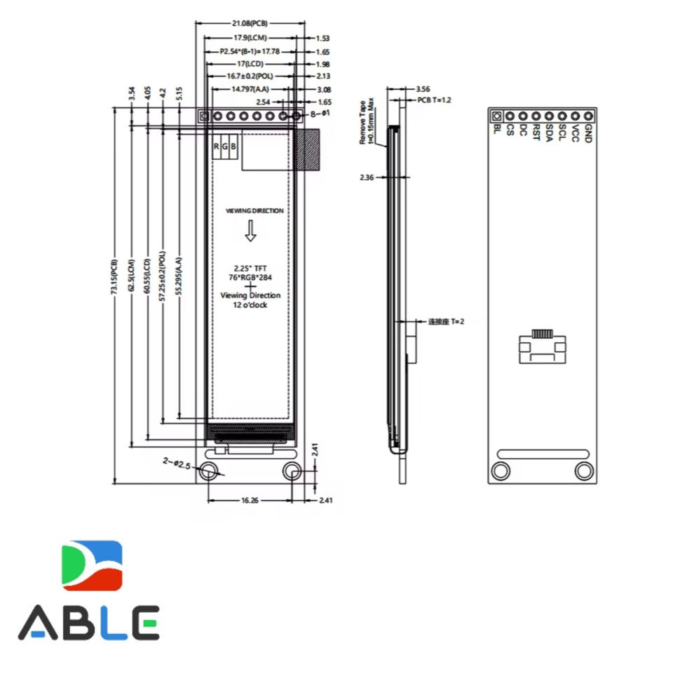 LCM Outline(W x HxT):21.08mm(W)x73.15mm(H)x3.56mm(T)