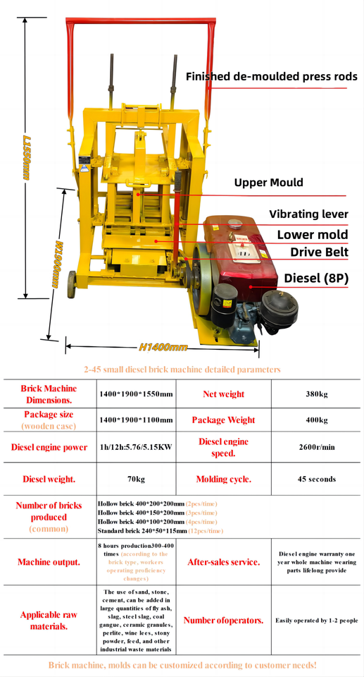 Core Components:Vibration motor, Lifting motor, Machine Molds