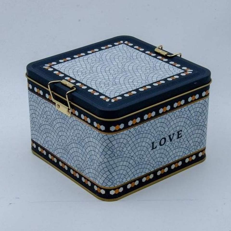2.5L Metal Storage Box with Wire Clasp 158x158x110 mm Square Geometric Mosaic Pattern Transparent Mosaic Lid