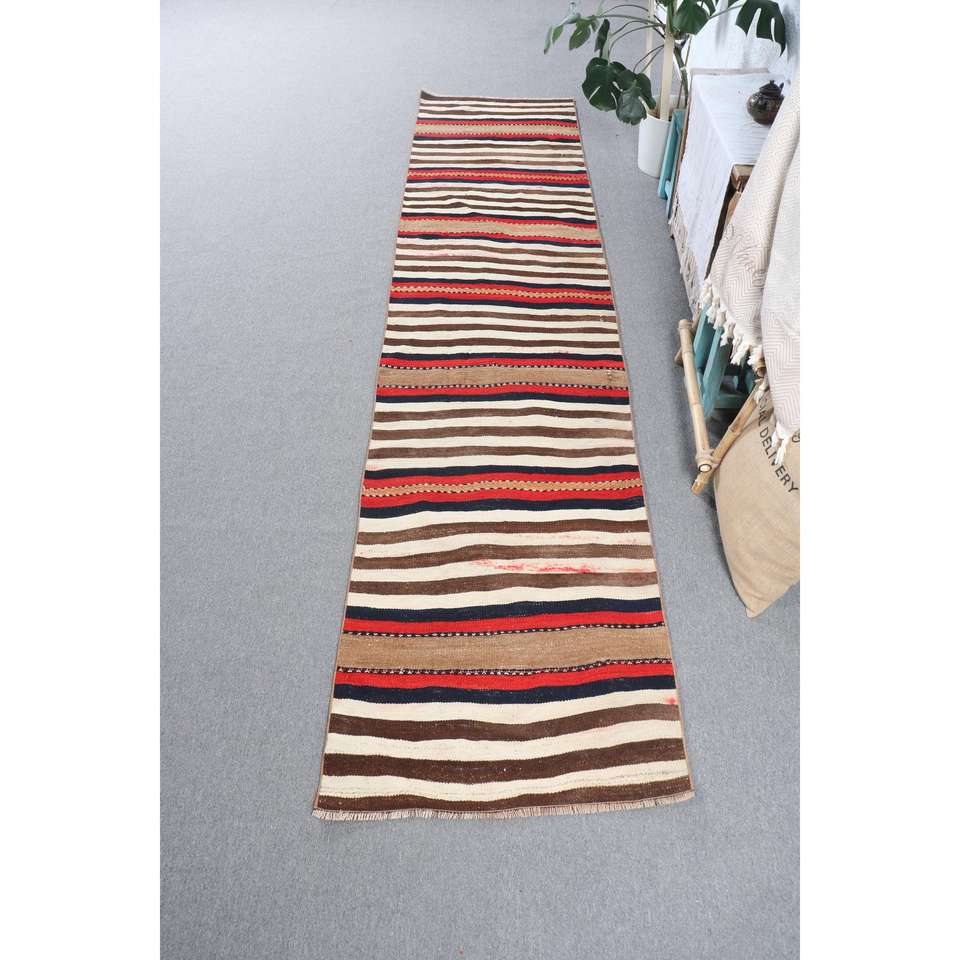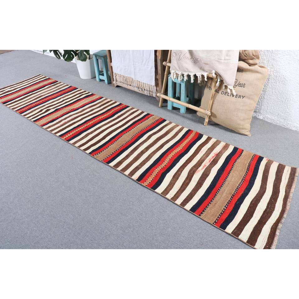 2.6x11.2 ft Turkish Rug, Vintage Runner Rug, Brown Red Oriental Rug