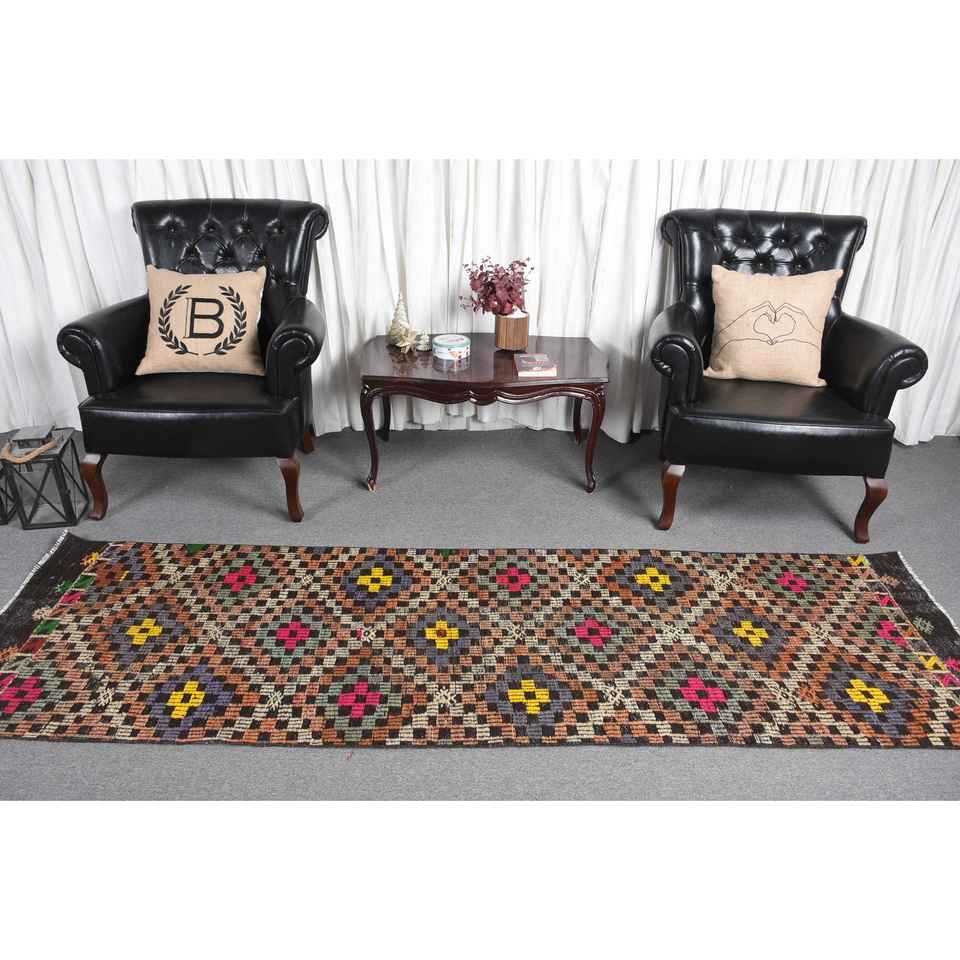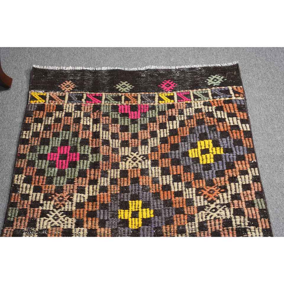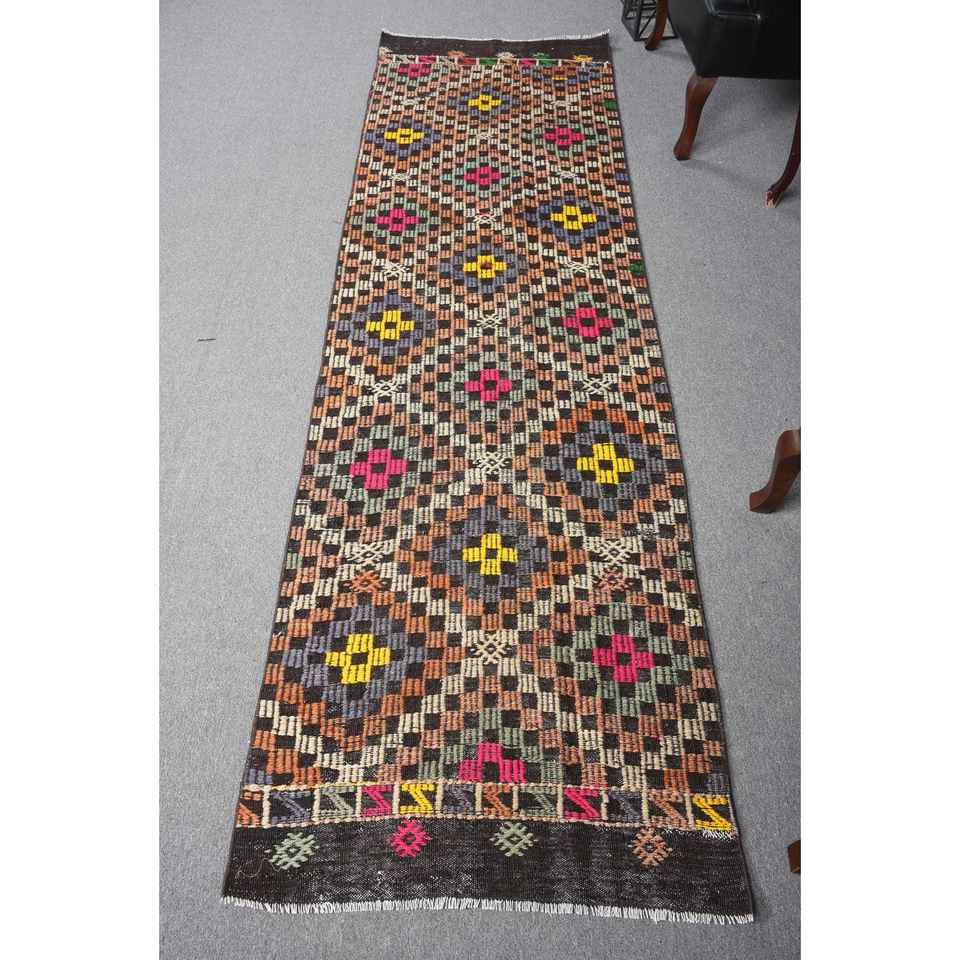 2.7x9 ft Kilim Turkish Rug, Brown Patchwork Vintage Rug Wool