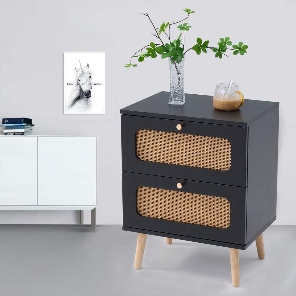 2-Drawer Handmade Rattan Nightstand End Table with Decorative Side Table Drawers for Bedroom or Living Room