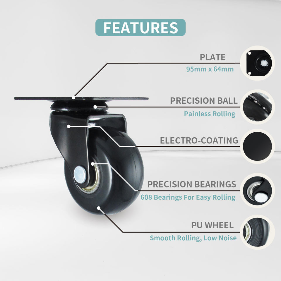 2 Inch Light Duty PU Swivel Caster Wheel with Brake 50mm Black Roller Blade for Outdoor Supermarket Use Custom Packaging 4-Pack
