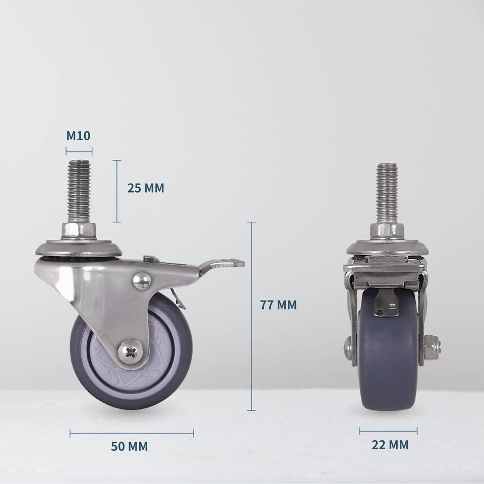 2 Inch Stainless Steel Wheel Stem M10 TPR Rubber Swivel Casters with Brake Smooth Rolling Furniture Wheel
