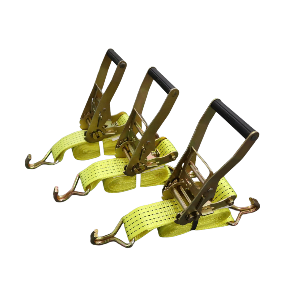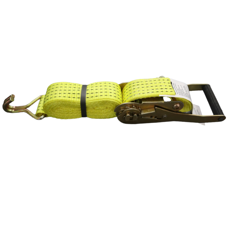 2 Inch Yellow Ratchet Strap Polyester Belt, Metal Buckle With J Hooks, Tension Strap Efficient for Salvage Car & Cargo Lashing