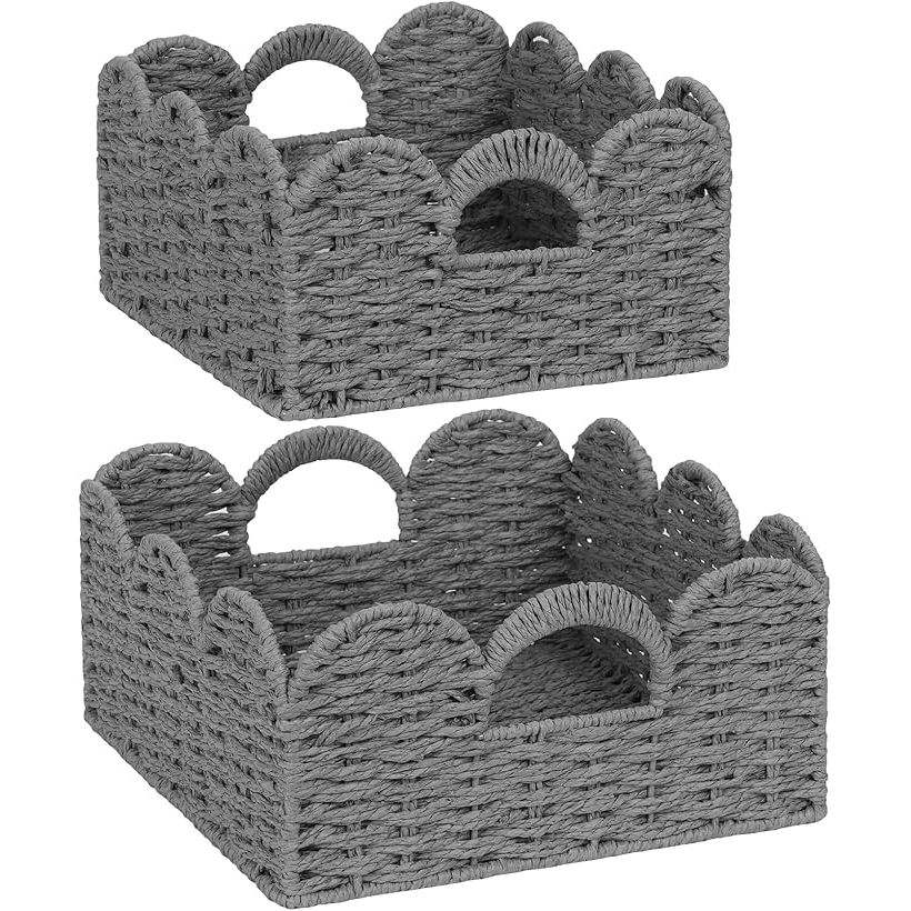 2-Pack Scallop Design Wicker Storage Baskets with Handles Handwoven Natural Paper Rope Bins for Home Decor