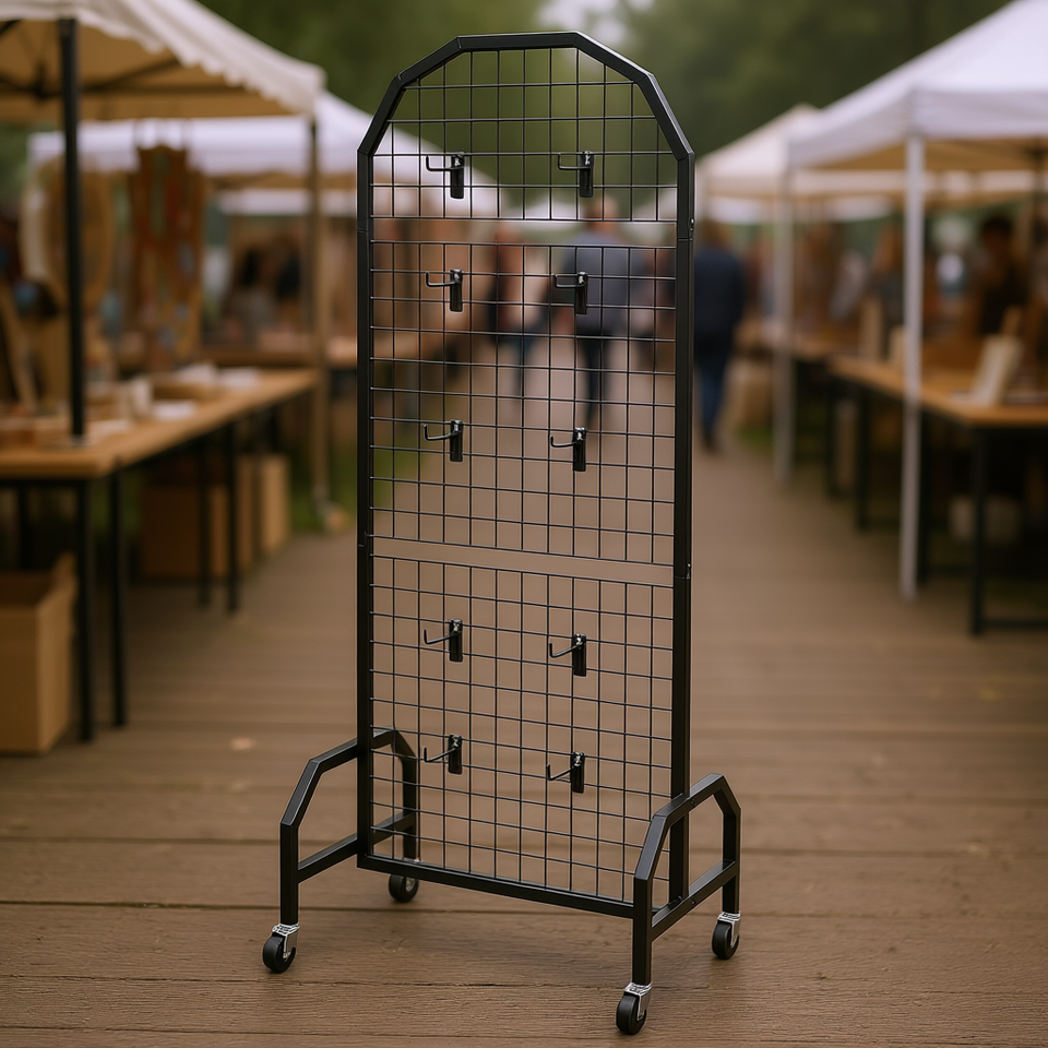Industrial Wire Grid Display Rack 1.9 X 5.4 Ft Carbon Steel Movable With Wheels Freestanding Art Panel