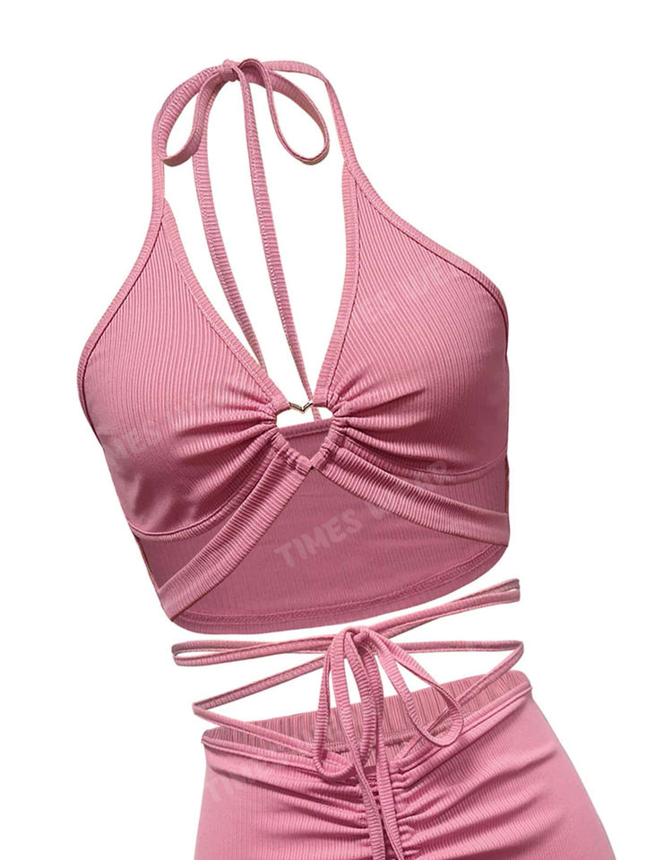 2 Piece 2022 NEW High Quality Fashion Ring Detail Tied Backless Women's Crop Top & Drawstring Skirt Set