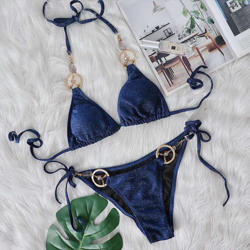 2 Piece Custom Woman Shinny Fabric Swimsuit Luxury Triangle Swimsuit Women Crystal Bikini Sets