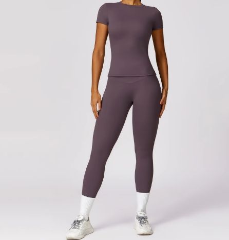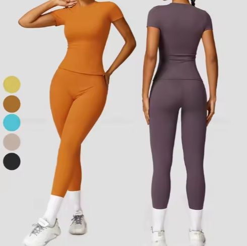 2 Piece Short Sleeve Training T-Shirts and Yoga Pants Set Activewear Women Nylon Outdoor Fitness Workout Yoga Sports Wear Set