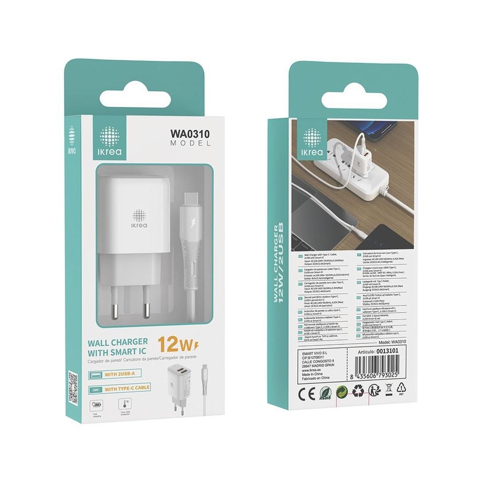 2-Port USB-A Fast Charger with Type-C Cable 12W White - Home Charger