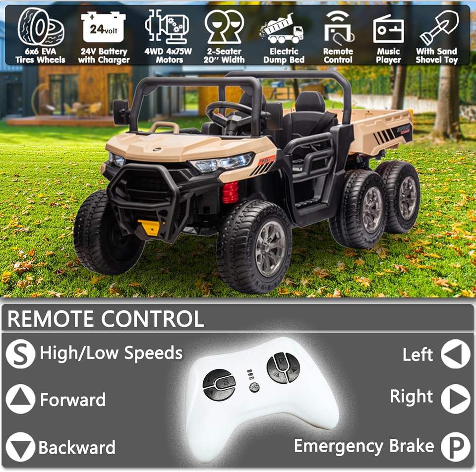2 Seater 24V Kids Ride On Truck with Electric Dump Bed, Extra Shovel, 4WD Battery Powered Ride On Toy Car with Remote Control