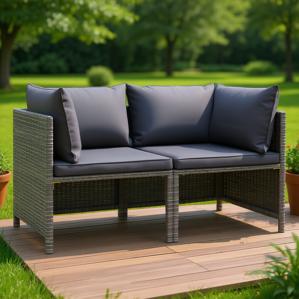 2 Seater Gray Poly Rattan Patio Sofa With Cushions Outdoor Garden Sofa Waterproof Contemporary Design