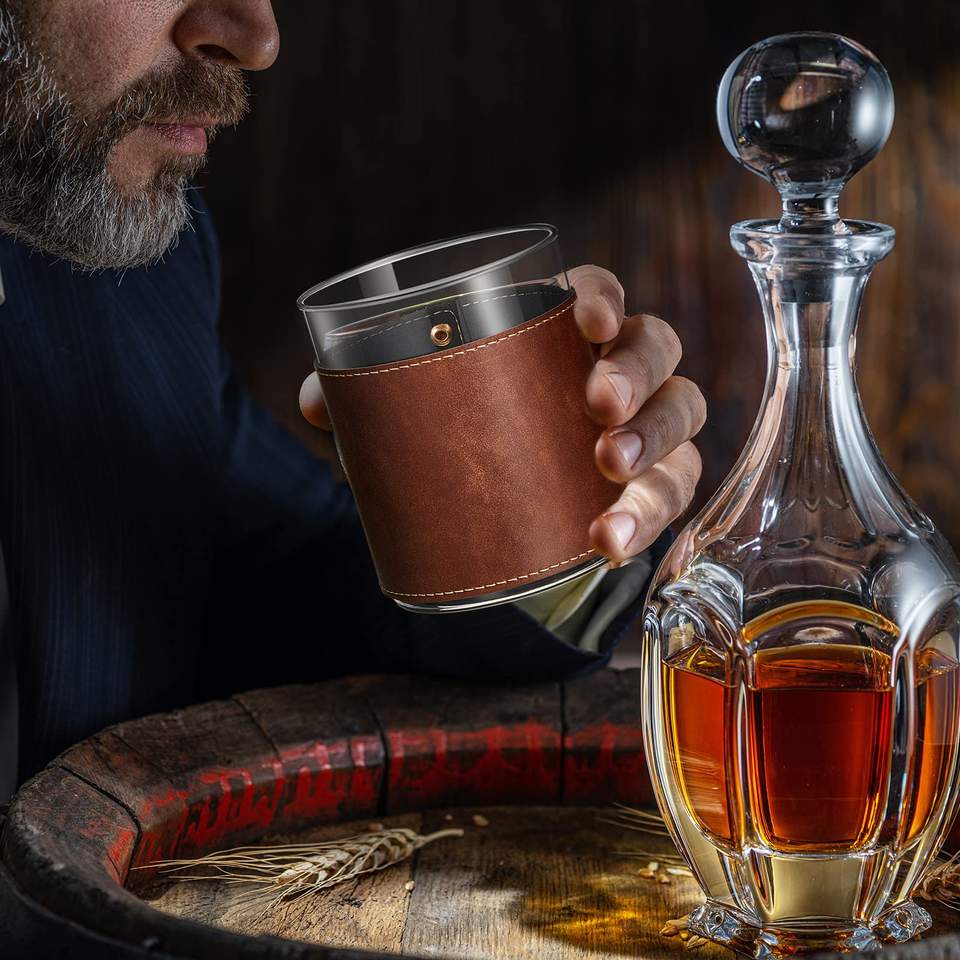 2 Sets of 11.5 oz Leather Wrapped Whiskey Glasses Brandy Snifter with Gift Box and Glass Sleeve for Men and Father