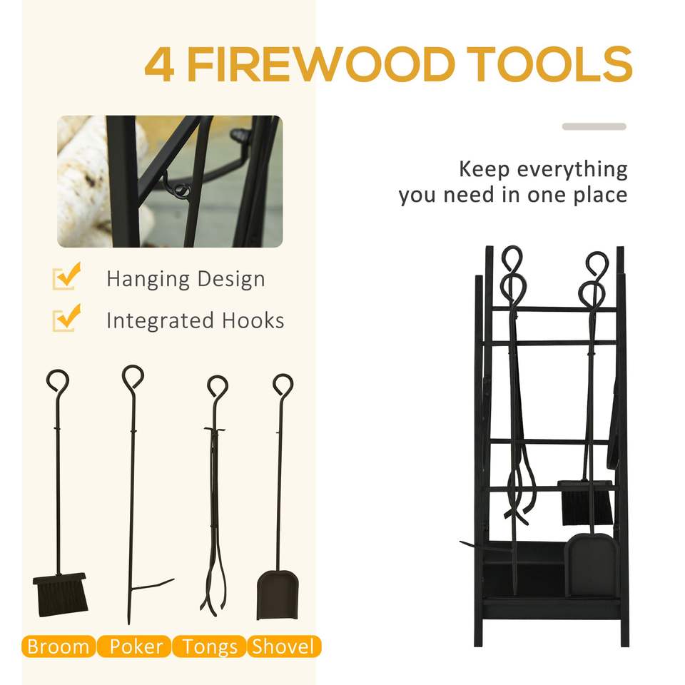 2-Tier Black Firewood Rack with Shovel Broom Poker Tongs Hooks for Indoor & Outdoor Fireplaces