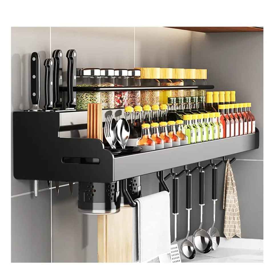 2 Tier Black Wire Spice Rack Organizer with Wood Base Kitchen Countertop Standing Storage Shelf Bathroom Vanity Toiletry Tray