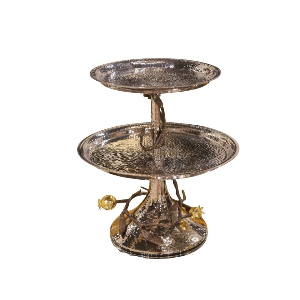 2 Tier Cake Stand Luxury Handmade Nickel Plate Metal Decorative Serving Platter With Gold Accent Bird & Floral Design For Sale