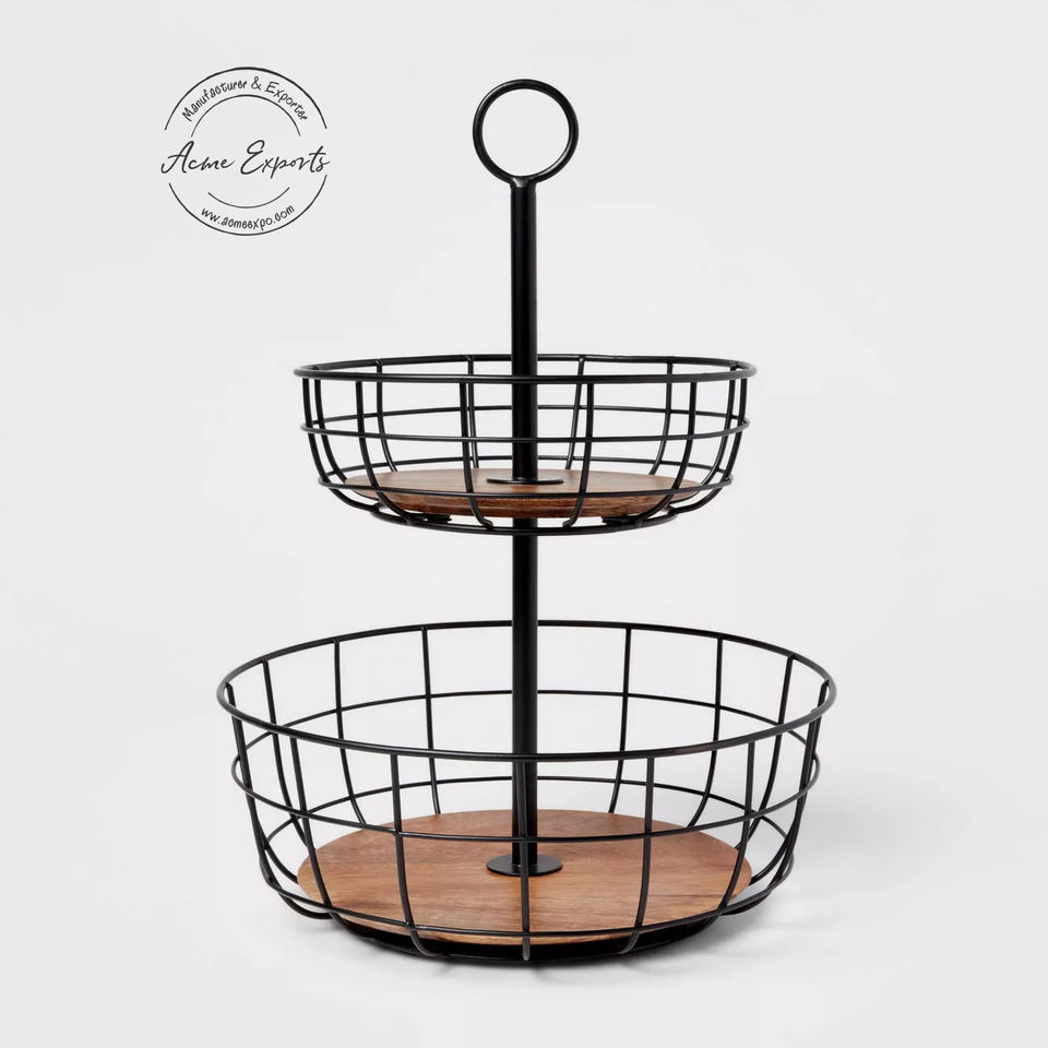 2-Tier Metal Wire Basket Stand with Wooden Base Stylish and Functional for Organizing Kitchen and Home Decor