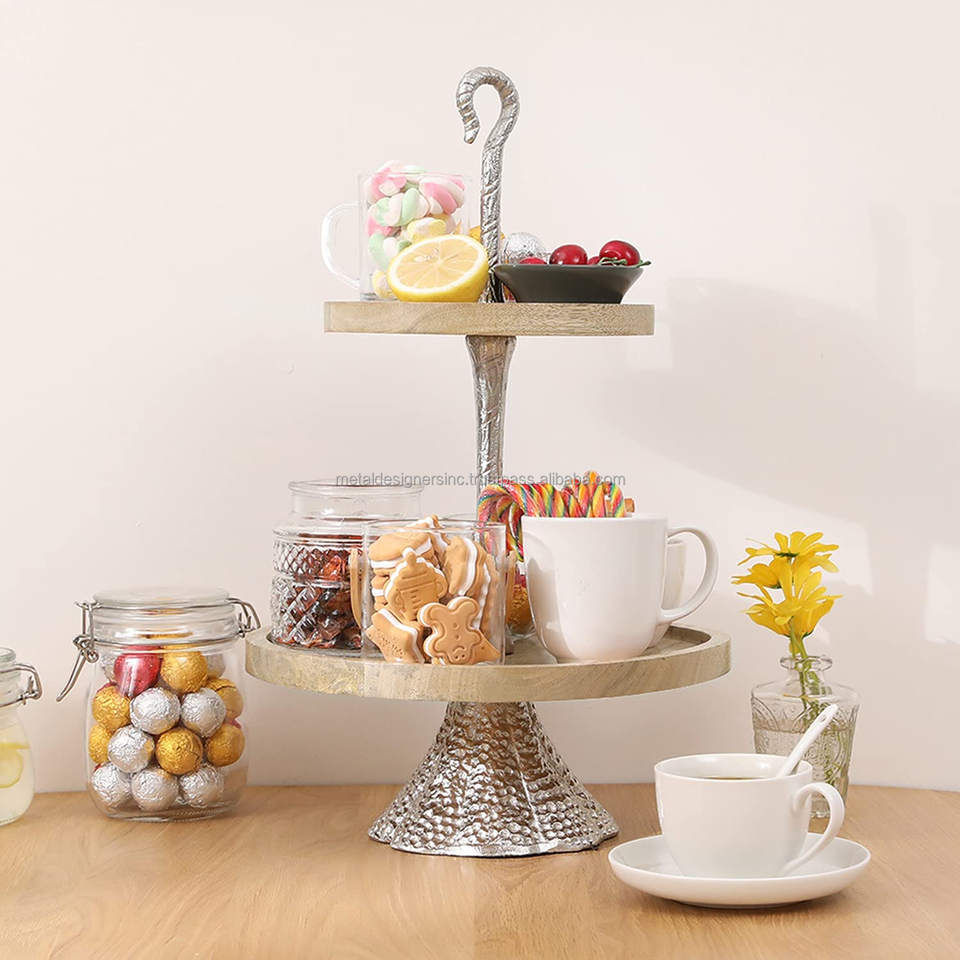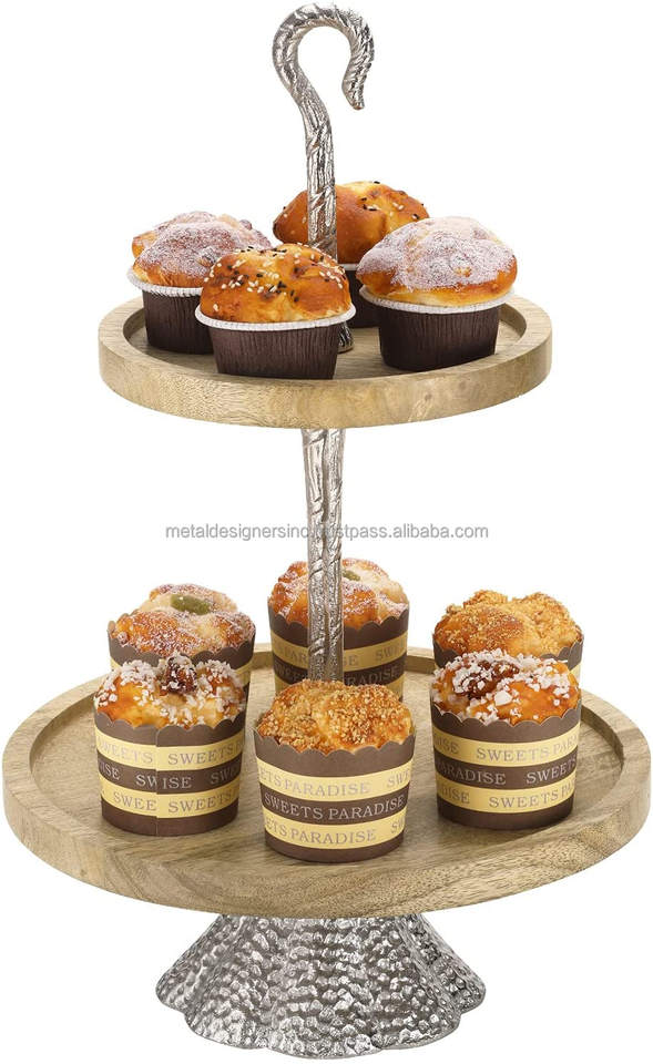 2-Tier Natural Mango Wood Serving Tray Tower Round Rimmed Plate Silver Metal Pedestal Hooked Handle Vintage Style Cake Stand