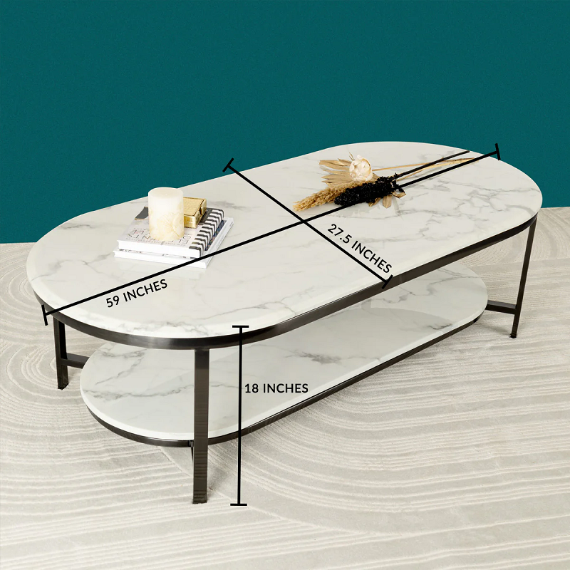 2 Tiers Modern Living Room Furniture Oval Shape Luxury Marble Top Convertible Eco-friendly Coffee Table with Shelf Metal Frame