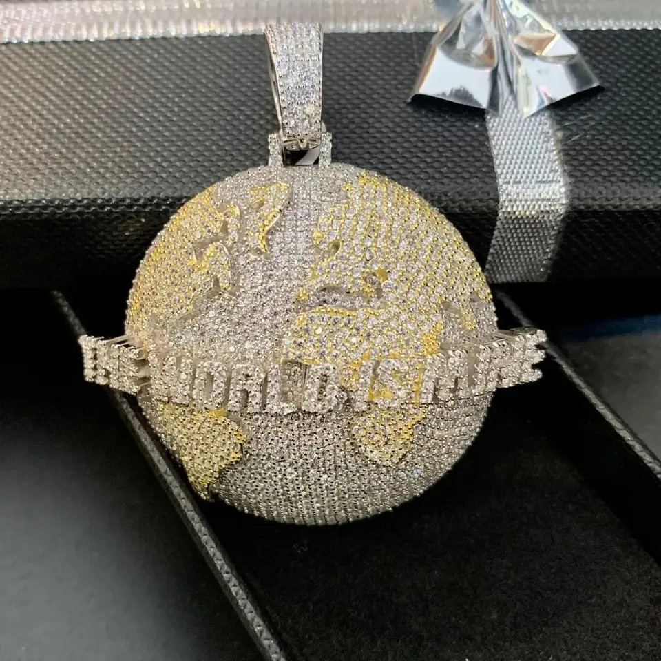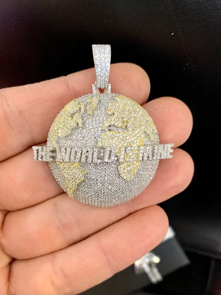 2-Tone Brass Earth Map Pendant Claw Setting Round Zircon Link Chain Unisex Hip Hop Fashion Party Jewelry World Mine Gift