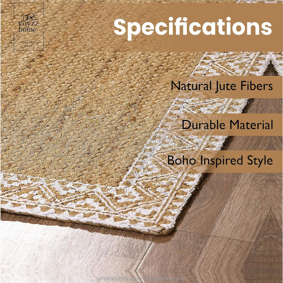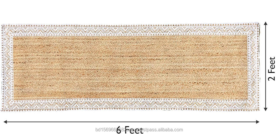 2 X 6-feet Woven Jute Rugs White Printed Border Stain Resistance High Pile Anti-Bacteria Pet Friendly Handmade Machine Made Rug