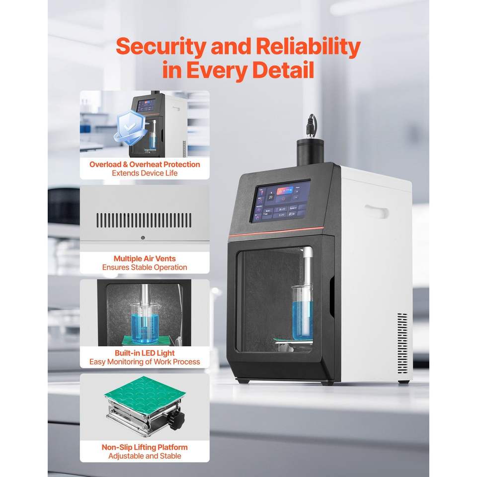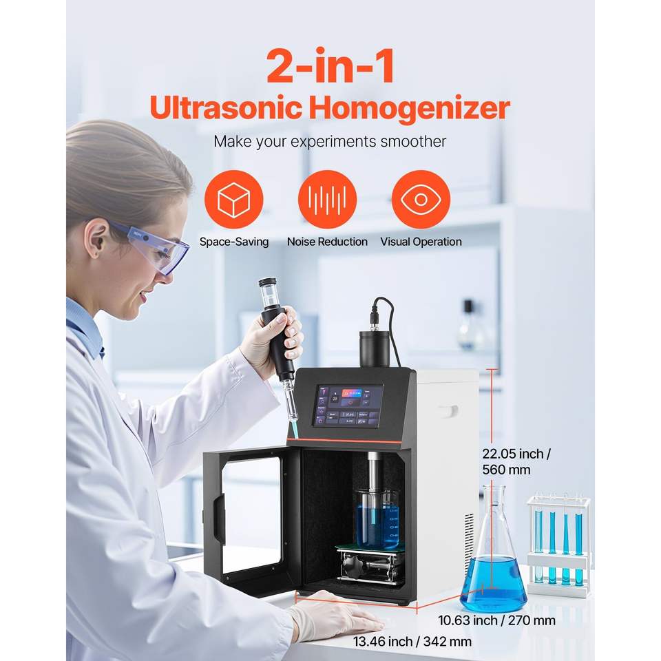 2-in-1 2000W Ultrasonic Homogenizer 0.79 Inch Titanium Alloy Probe 20KHz Frequency Continuous Timer Pulse Three Modes Noise