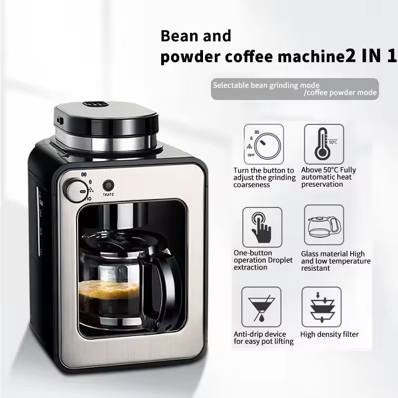 2 in 1 Drip Coffee Maker Been Grinder Marks Automatic Home Commercial Small Coffee Machine with Coffee Pot Scoop for Flower Tea