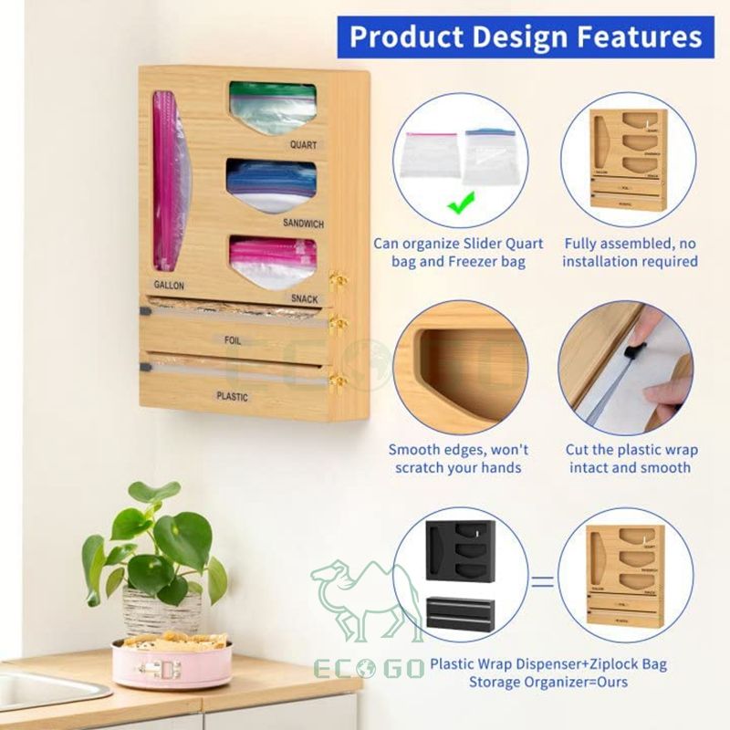2 in 1 Kitchen Bamboo Organizer for Plastic Foil Wrap Ziplock Bag Dispenser for Food for Storage and Preservation