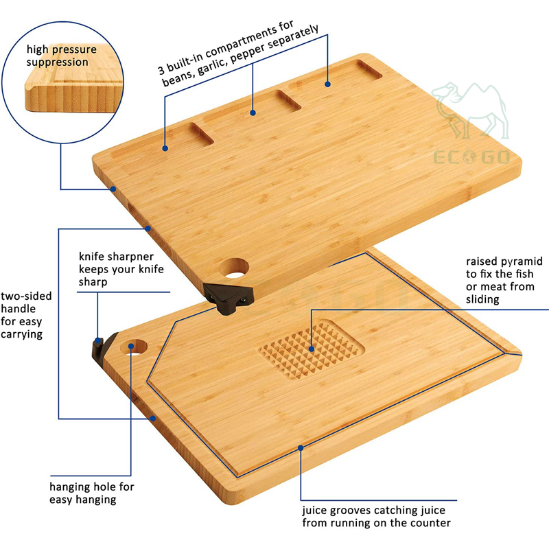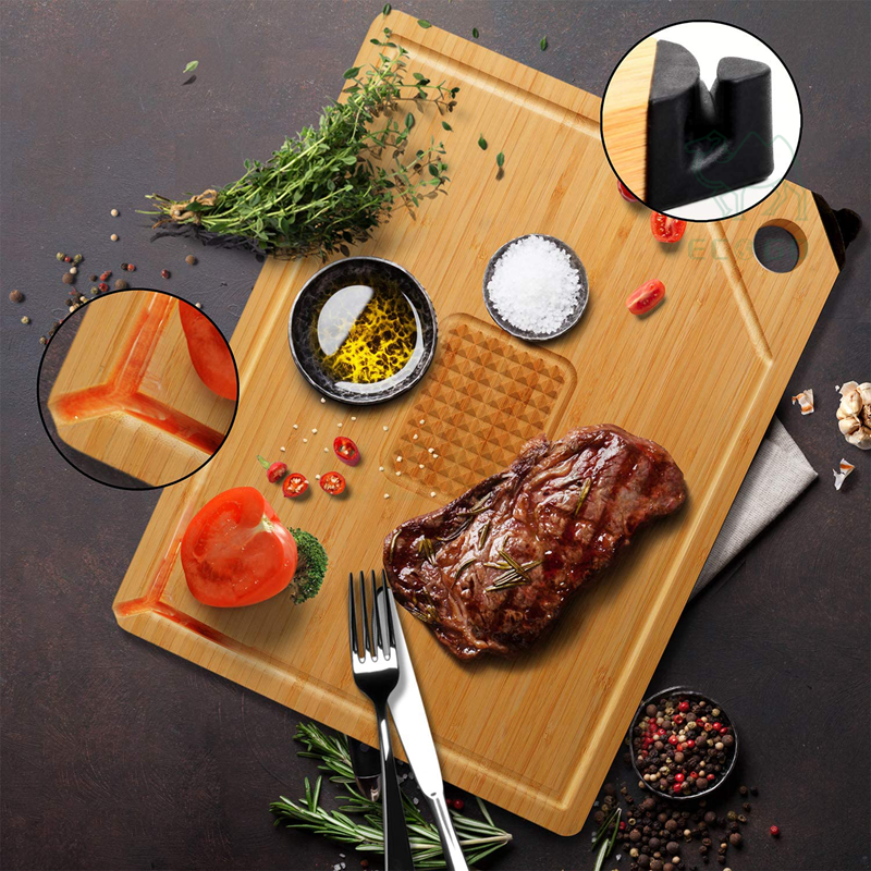 2 in 1 Organic Bamboo Wooden Cutting Board With 3 Built-In Compartment Knife Sharpener for Food
