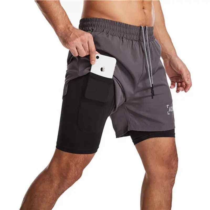 2 in 1 Stretchy Workout Running Fitness Wear Bodybuilding Shorts With Zip Pocket and Tights Spandex Gym Shorts for Men