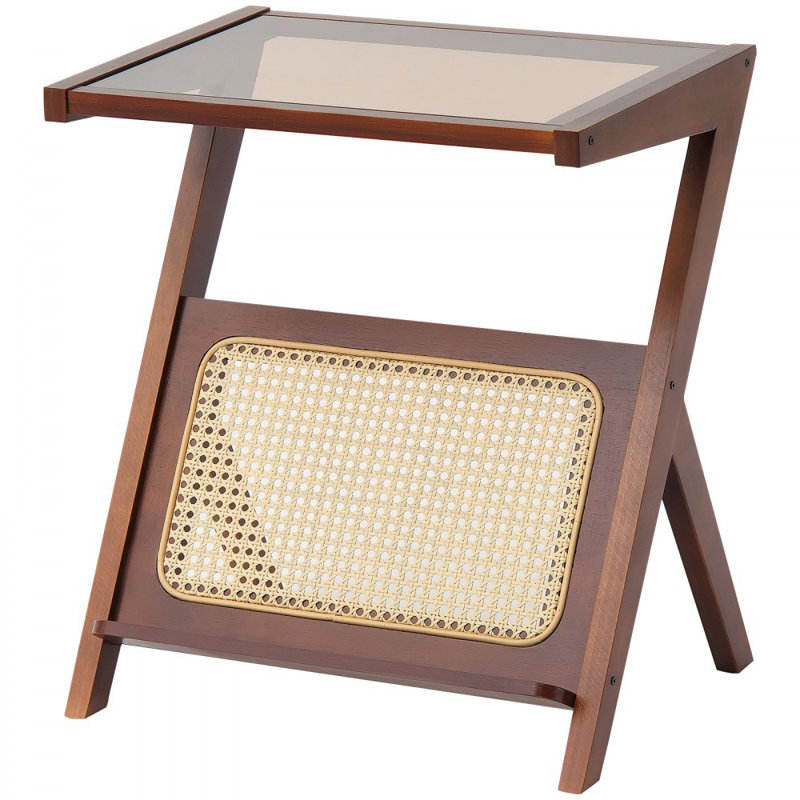 20'' Modern Boho Mid Century Coffee Table with Z-Shaped Rattan Woven Bamboo Tempered Glass Top and Storage End Table
