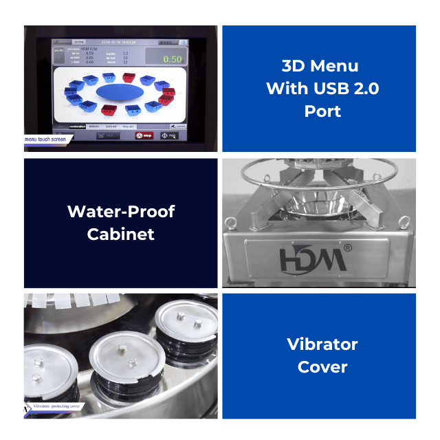 core components:Motor, PLC, 3D Menu, Modular Design, Waterproof Cabinet, SS304 Actuator Housing, Square StrongBody, USB 2.0 Port, 10/14/20 Heads, 1.6L & 3L Hopper Volume, Rounded Corner Hopper, Optional for Tefflon Coating Hopper, 10.4" Color Touch Screen, Load Cell, Full SS304 Machine Body