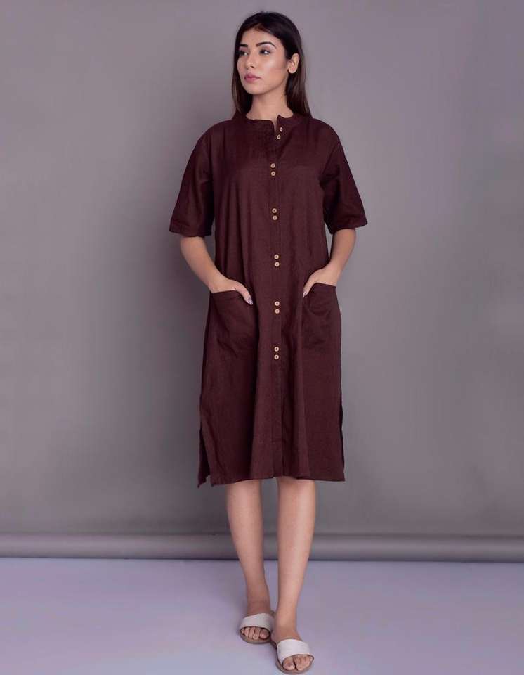 2026 New fashionable trending latest design maroon color crepe fabric jewel neck half sleeve said pock linen dress