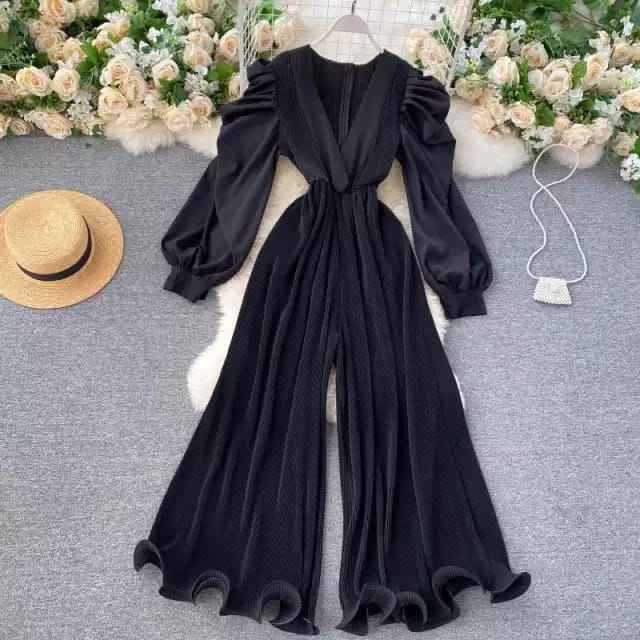 2022 Hot Sale Casual Bohemian V Neck Sexy Backless Loose Wide Leg Pants Long Sleeves Jumpsuit