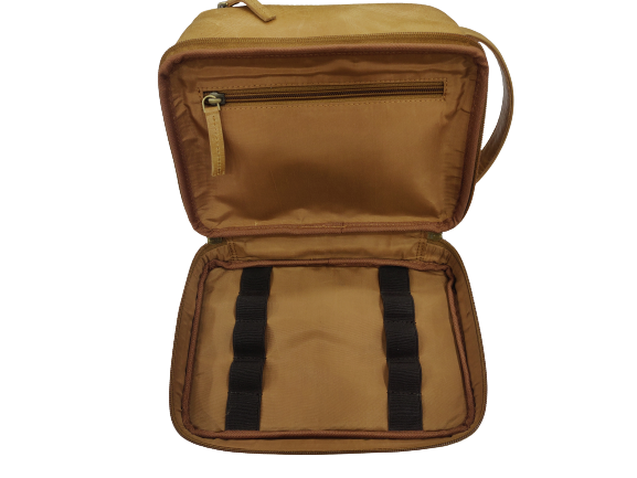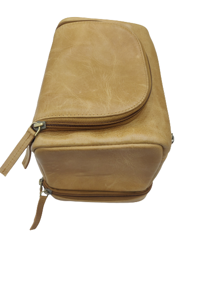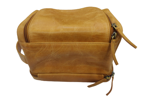 2022 Wholesale Fashionable Vintage Caramel Genuine Compact Leather Travel Kit Durable Bottom Compartment Zipper Geometric Design