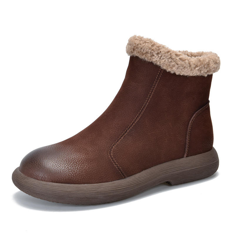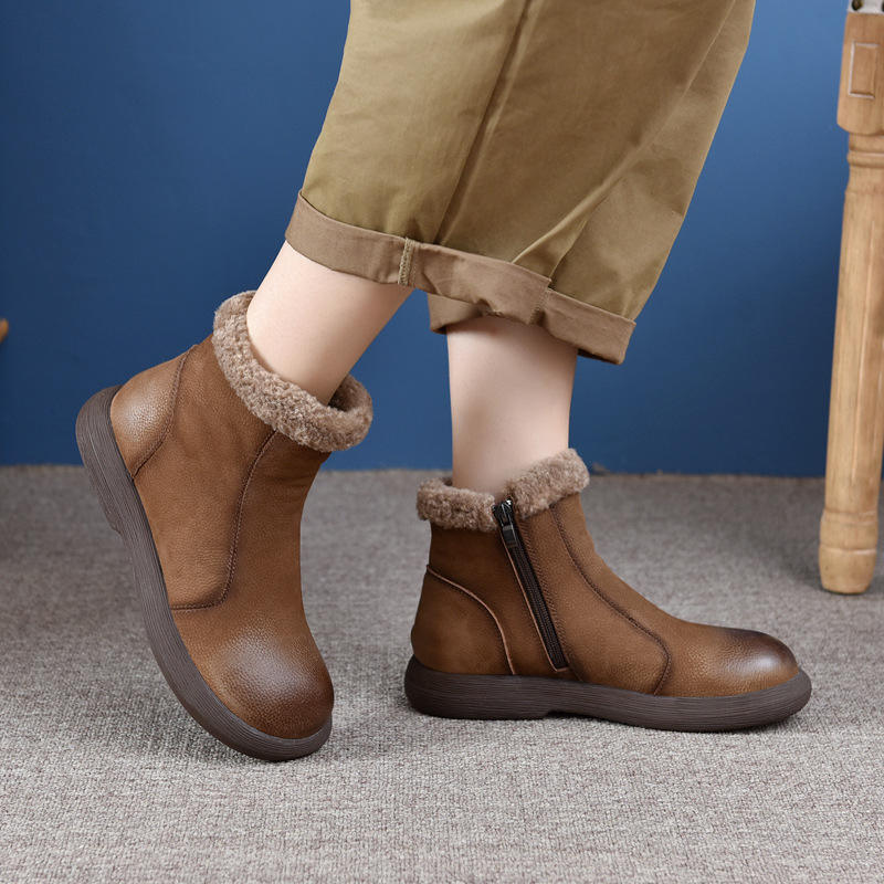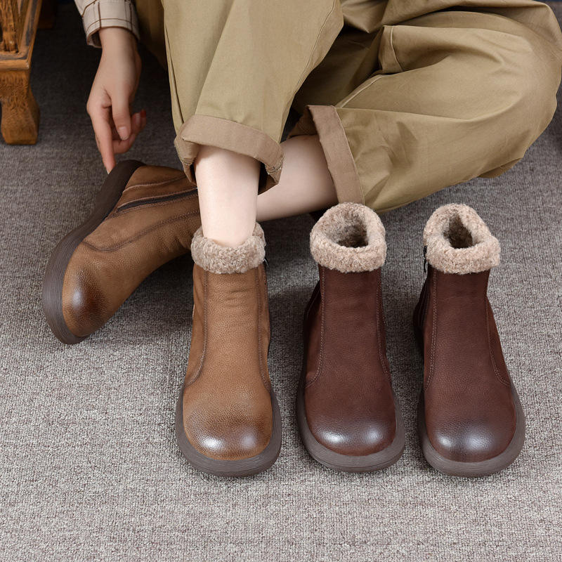 2023 Autumn Winter Women's Casual Short Boots Top Layer Cowhide High Top Lambskin Lining Velvet Versatile Mid-Tube Short Boot
