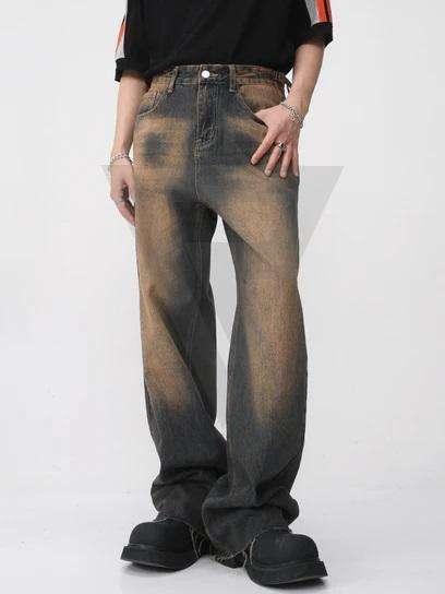 Mens Mid Breathable 100% Cotton Jeans Dark Denim Fabric Acid Wash Straight Loose Fit Custom Hip Hop Baggy Wide Leg Casual Trendy