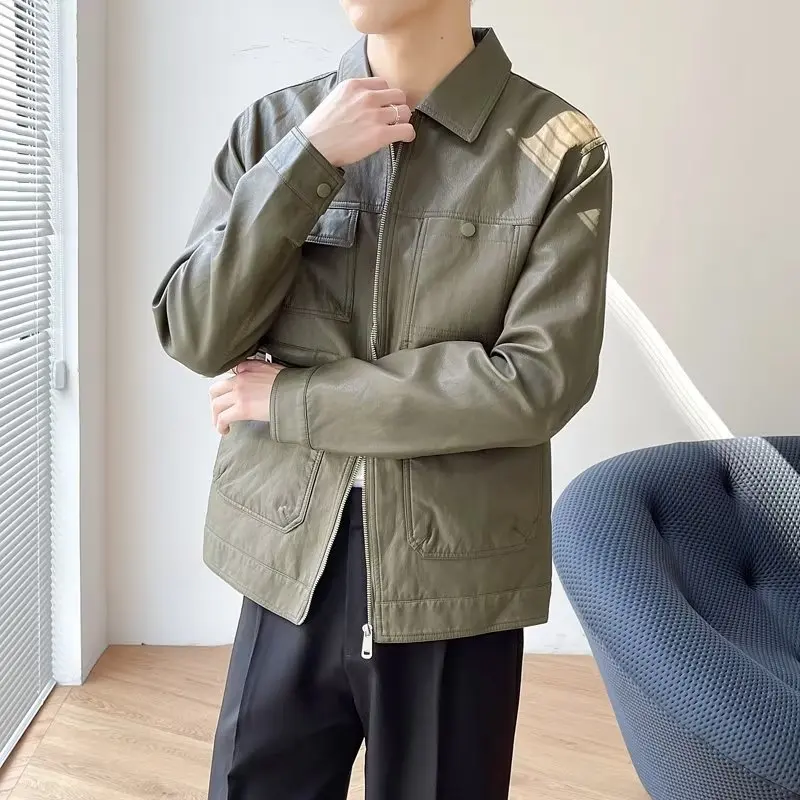 2023 New Trendy Korean Version Faux Leather Motorcycle Jacket Men Spring Autumn Winter Clothing Fleece Fabric Coffee-L Size