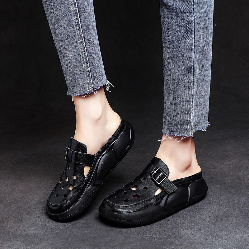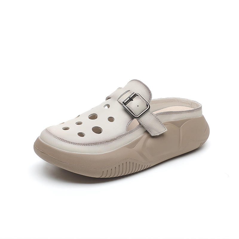 2023 Summer Genuine Leather Half Slip-On Retro Baotou Sandals for Women Thick-Soled Platform with Hollow Hole Cowhide Shoes