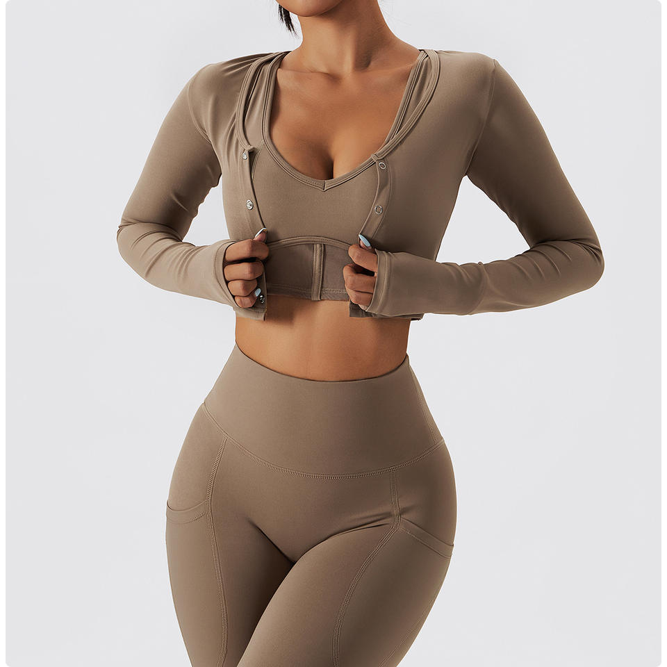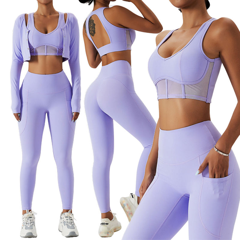 2023 Women 3 Piece Athletic Wear Long Sleeve Ribbe Yoga Set Mesh Sports Bra Fitness Leggings Suit Gym Clothing